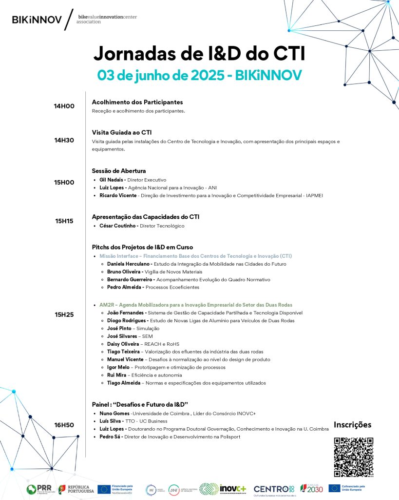 This event is transversal to all the projects underway at the Technology and Innovation Centre, namely: Interface Mission – Core Funding for STI’s and AM2R – Mobilizing Agenda for Business Innovation of the Two-Wheeler Sector, both funded by the Recovery and Resilience Programme (RRP) and the European Union’s (EU) NextGeneration Funds.