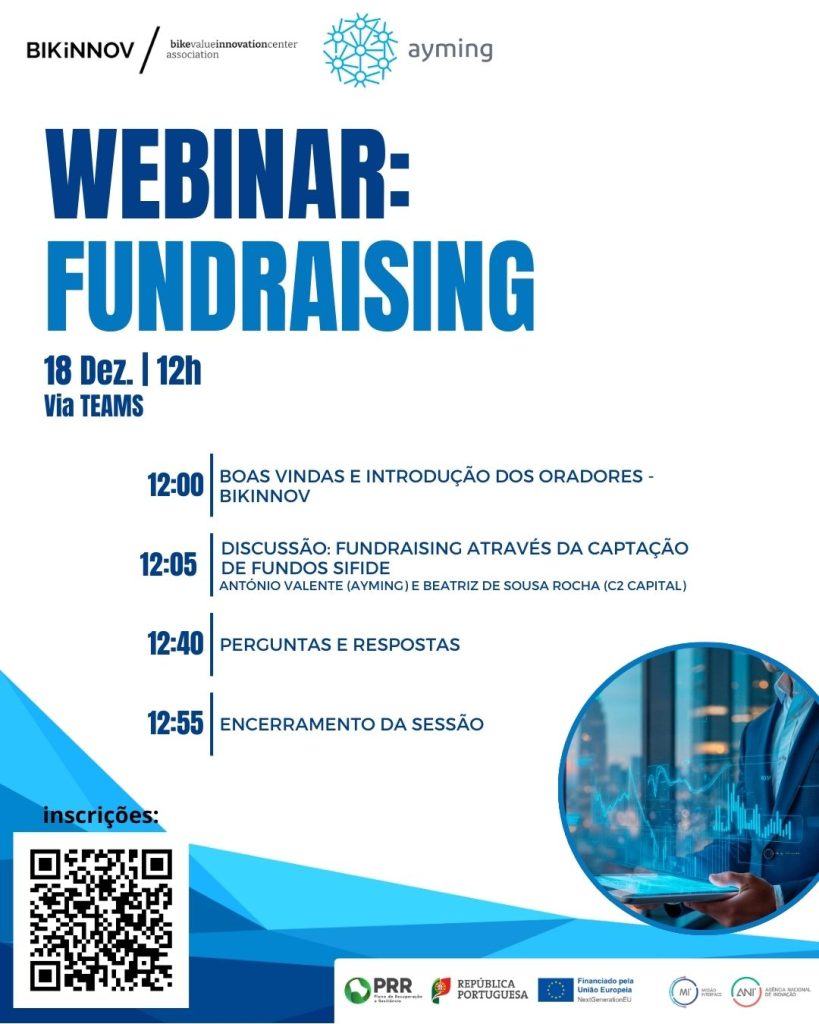BIKiNNOV will host the webinar “Fundraising” on December 18, 2025, at 12:00 p.m. This online session is dedicated to exploring the potential of SIFIDE Funds as an investment-raising instrument for companies and innovation projects. The objective is to provide a practical and clear overview of how this mechanism can support organizations in accelerating their development and strengthening their growth strategies.